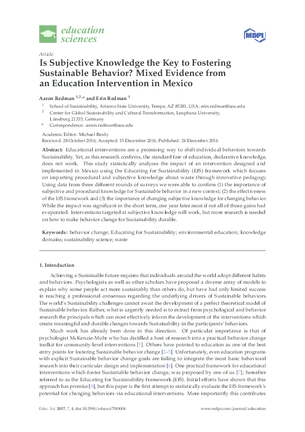 Pdf Is Subjective Knowledge The Key To Fostering Sustainable Behavior Mixed Evidence From An Education Intervention In Mexico Aaron Redman Academia Edu